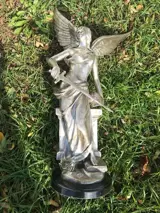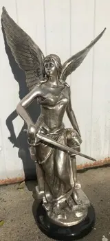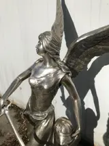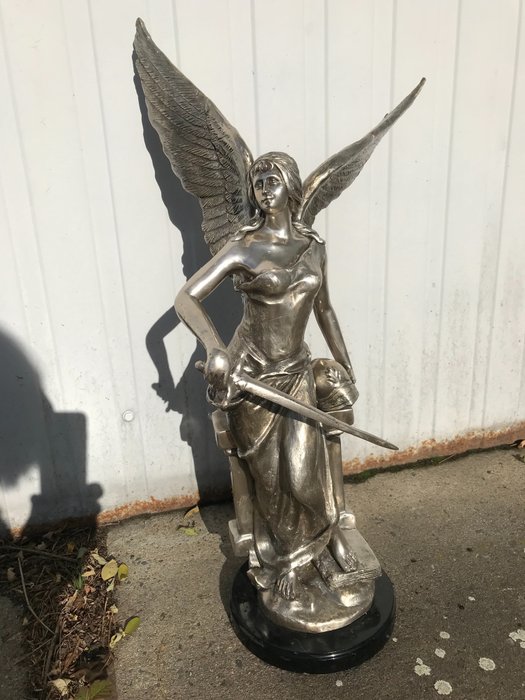 Sculptuur engel krijger brons.Dit magnifieke beeld stelt een engel krijger voor van bijbelse proporties. Ze leunt op een grafsteen en houdt een helm vast terwijl ze een zwaard hanteert. Een werkelijk ontzagwekkend werk. Dit aantrekkelijke stuk zou een tuin of een terras in huis verfraaien.