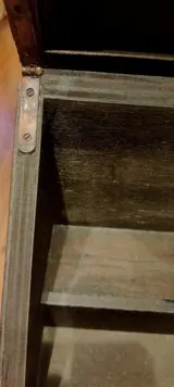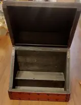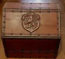 Mooie opbergdoos voor op het bureau van hout bekleed met donkerrood leer met prachtige versieringen, de zijkanten zijn bezaaid met studs.