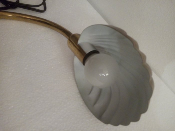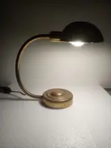 Bureaulamp uit de jaren 60 en tijdens restauratie gevonden op zolder. In perfect werkende staat, het object heeft wat vlekken en oxidatie die echter niet esthetisch zijn. E14 fitting met originele bedrading. De schelpvormige diffusor is aan de binnenkant geëmailleerd.
