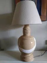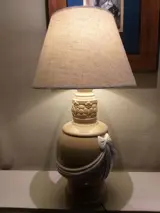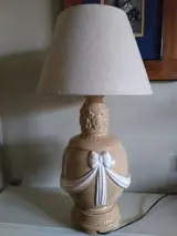Elegante vintage design lamp geëmailleerd in glanzend gebroken wit en creme kleur van de firma Manises Hispania, neoklassieke stijl in de vorm van een grote beker met prachtige art novoau reliëftekeningen van mediterrane stijl. De lamp met E27 fitting is 54 cm hoog zonder kap X 25 cm breed De lamp wordt zonder kap verzonden. De lamp is origineel van Manises. Voor vervoer wordt gezorgd. Niet bieden in Engeland i.v.m. problemen met de douane