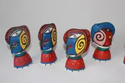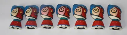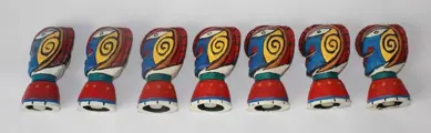 7 Clemens Briels flessenstoppen beelden in goede conditie. Ze zijn gesigneerd. Ze zijn 13 cm hoog. Beschilderd op resin met kenmerken kleurenkeuze van Clemens Briels. Worden aangetekend verzonden.
