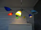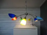 1x Hanglamp metaal met zwenkarmen en 6 gekleurde glazen kappen.