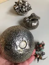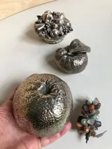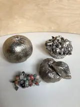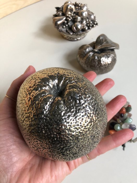 Lot decoratief fruit voor in huis in gelamineerd staal/zilver (een sinaasappel, een mandarijn, een mand met granaatappels, druiven, amandelen, vijgen...) plus een klein trosje druiven in twee gemengde stenen. Afmetingen zijn overgenomen van de foto's.