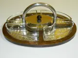 Met vijf glazen schalen waarvan één met deksel, spiegel, RVS handgreep en houten voet.