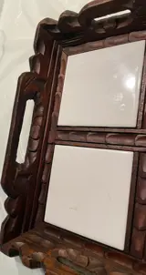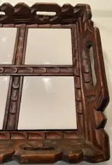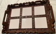 Een ongewone vintage dienblad in hardhout gesneden met schildknaaptegels uit de jaren 1920.
