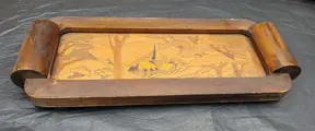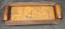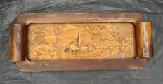 Zeer interessant klein dienblad in Art Deco stijl. Gemaakt van hout, met landschap, vakkundig gemaakt op het lichaam van het dienblad. Het kunstwerk is rechtsonder gesigneerd door MG.