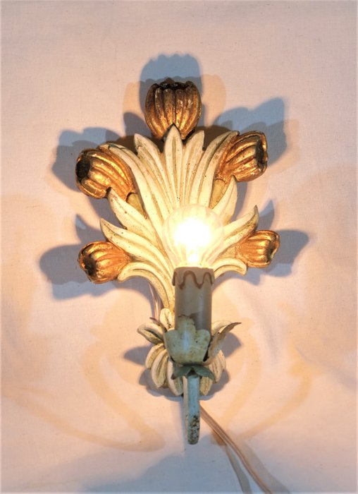 Een lichte applique in heel mooi houtsnijwerk met een afbeelding van een bos tulpen met bladeren, de arm die het licht vasthoudt, is van smeedijzer, alles met artistiek handmatig vakmanschap afgewerkt met een polychrome lak, ook met de hand beschilderd, en de decoratie van de tulpen in bladgoud.