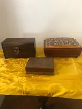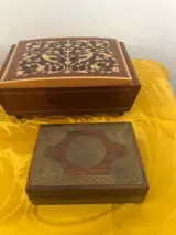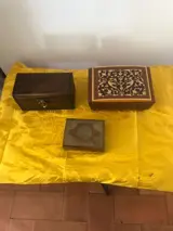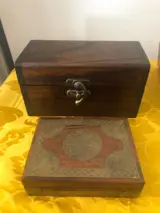 De tweede is een heel bijzonder klein kistje omdat het van hout is gemaakt en om het te verrijken is er wat koper toegevoegd dat het onderscheidt van de gebruikelijke kistjes.