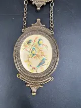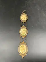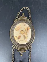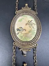 Trio van bronzen of messing lijstjes, aan elkaar gekoppeld met zijde print, vintage vogels(licht vervaagde kleuren).