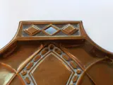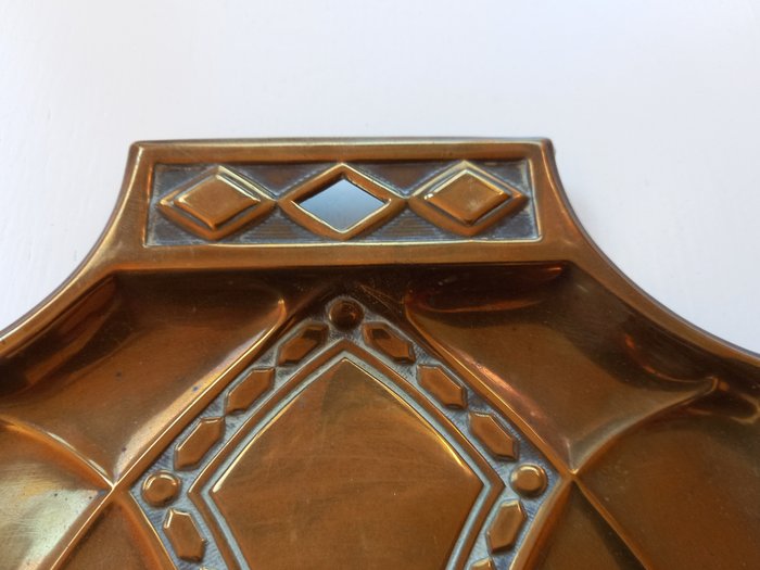 De afmeting van het jugendstil / art nouveau blik is circa 18 cm breed en 21 cm lang. De bijbehorende stoffer is 29 cm.