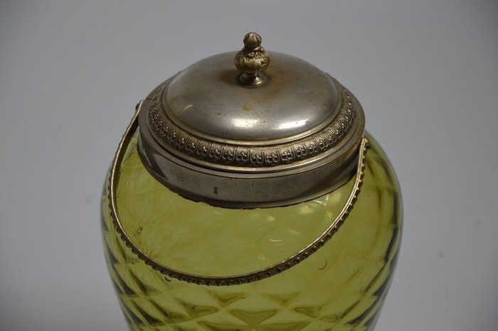 Een mooie antiek glazen koekjespot met hengsel - Glas, Verzilverd