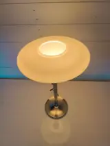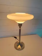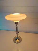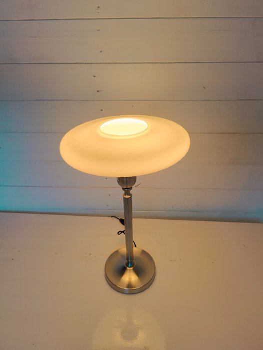 Fraaie en stijlvolle originele designtafel-/bureaulamp uitgevoerd in wit opaal glazen kaping met RVS details.