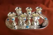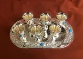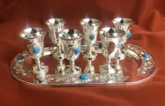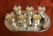Een prachtige set van zes likeurbekers op een ovaal bord, met ingelegde cabochons in blauwe tourquoise. Uitgevoerd in verzilverd. Schitterend, ongedragen, instandhouding, briljant, klaar om te serveren. Plaatmaat: 20 x 16 x 2 cm.