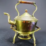 Koperen ketel met een bijbehorende Fa E.G. Verkade & Zn Waxine rechaud voorzien van Art Nouveau elementen (handvaten)