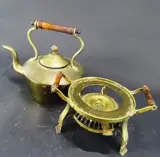 Ketel en rechaud verkeren in een goede staat, met gebruiker sporen, bij 1 hengsel ontbreekt een houden dopje (zie laatste foto) Om de ouderdom patina te behouden is het stel niet gepoetst
