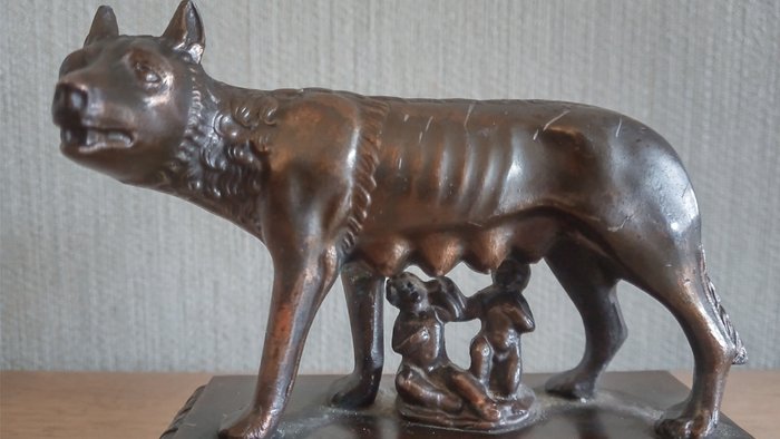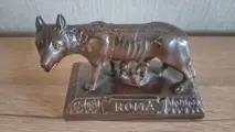 Een figurine wolvin metromulus en remus van brons/messing met de tekst SPQR