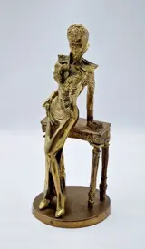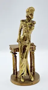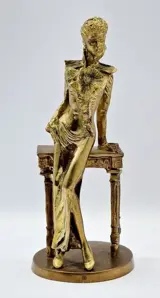 Prachtig beeldje, gemaakt van brons in het begin van de 20e eeuw, voorstellende een mooie dame, met een mooi figuur, leunend op een tafel.