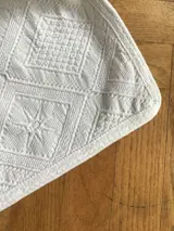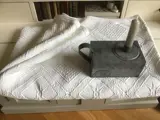 De sprei geeft een duidelijk Franse sfeer want dit soort heel dikke katoen zie je haast niet buiten Frankrijk. Is daar ook gekocht op zo’n marktje. Evenals de blaker die handgemaakt is van zink,met zijn laadje voor voorraad kaarsen.