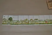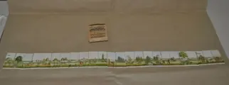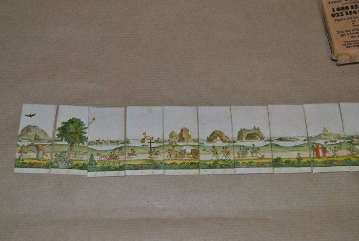 Compleet met 24 handgekleurde genummerde kaarten met alfabet en deel van landschap, in doosje.