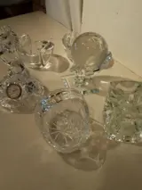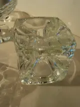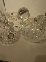 mooi lot van 8 verschillende glas / kristal objecten---bestaande uit 2x val saint lambert fruitschaal op poot en een dienschaal---1x kristal mandje--1x stijgerend paard met in gebouwd horloge--1x kubes kaars houder--2x j g durand abstact kristal---1x glazen bol met gegraveerd wereldlanden op standaard deze is afneembaar --deze objecten zijn onberispelijk