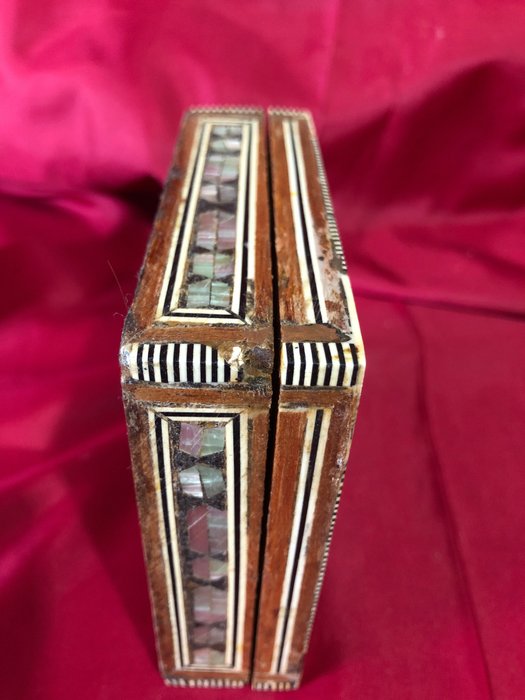 -een Egyptische cloisonnédoos van parelmoer en been, prachtig inlegwerk in een vierkante vorm, 10,5x10,5x3,5 cm, rood fluwelen binnenkant
