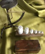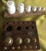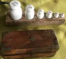 houten blok met6 porselein gewichten., gemerkt in "dkg" 1/2 tot en met 20 dkg,. voorzien van ijkmerk.