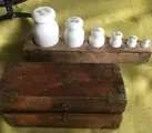 Prachtig oud kistje met 10 oud hollandse gewichten,10 delig van 1 gram tot 200 gram., voorzien van veel keurmerken.