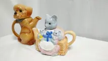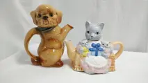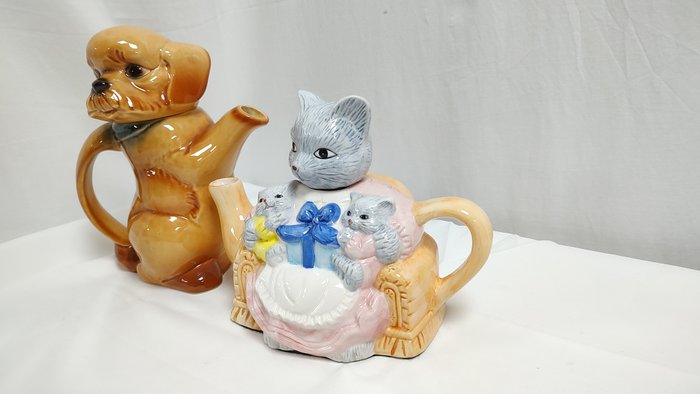 2 leuke vintage Giebel theepotten in de vorm van een hond en een theepot met katten