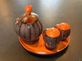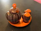 Werkelijk prachtige suiker, peper en zoutstel van Goebel West Germany, vermoedelijk jaren 50, in prachtige kleurstelling oranje met bruin, en witte accenten.