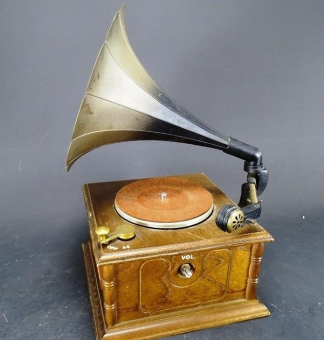 Vintage grammofoon tafelmodel, uitgebracht in de jaren ‘64/’68. Voorzien van een fraaie hoorn (sier)