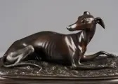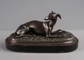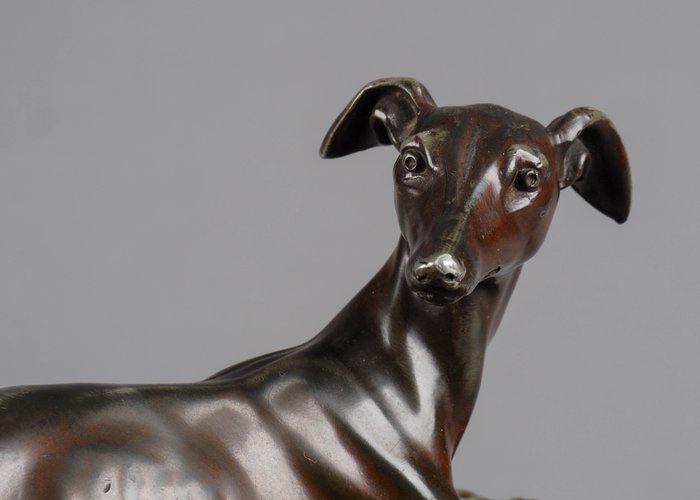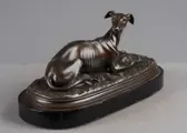 Fraai vormgegeven liggende Greyhound of hazewind hond op fraaie voet. Materiaal brons of bronskleurig. lengte 24 centimeter, gewicht 1 kilogram. In hele mooie oude staat.