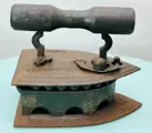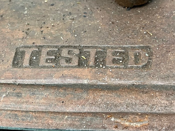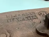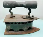 Grote houtskoolbakplaat van ijzer met de bronzen afwerking is de basis. Het is een heel oud strijkijzer van meer dan 120 jaar in goede staat met meestertekens in het midden.