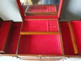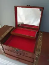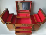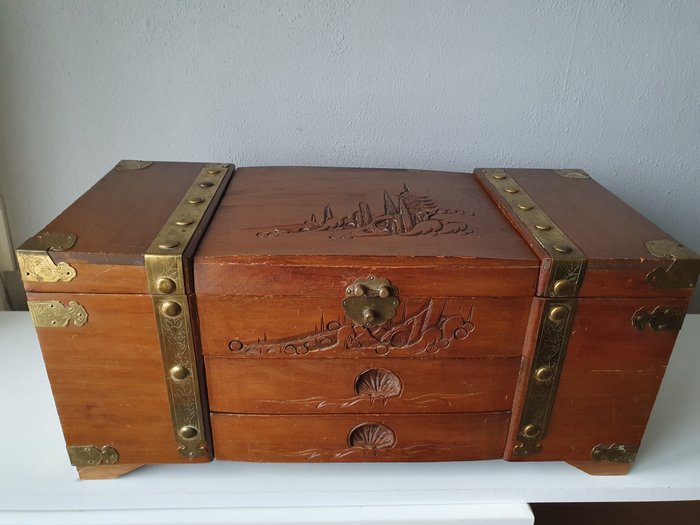 Prachtige grote juwelenkist of sieradenkist met messing beslag en een Aziatisch houtsnede tekening op de kist.