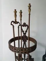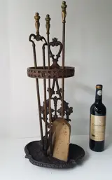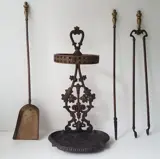 De grijper, pook en schep zijn van messing, evenals de ronde ring aan de top.