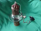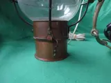 Koperen hallamp met rond glas, electrisch E27. met lang snoer. De ophangen constructie is uitgevoerd met een paardenbit. Totale hoogte is 72 cm.Zie ook de foto's.