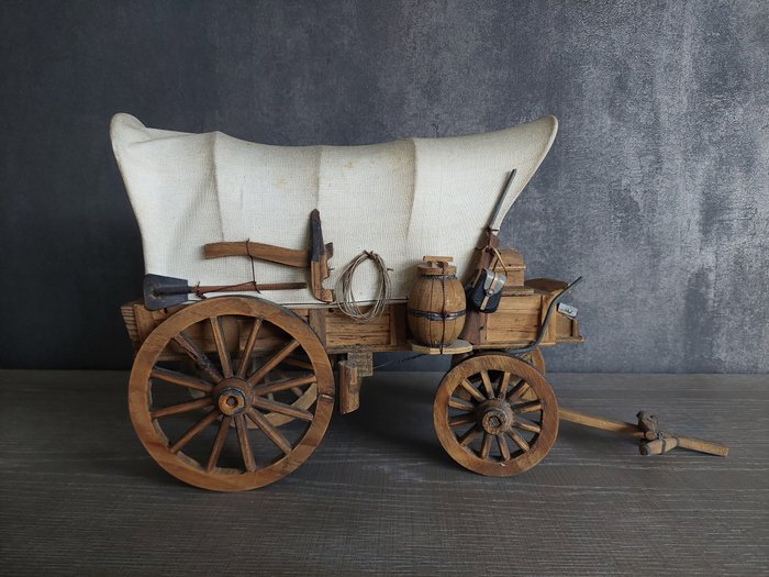 Zeer nauwkeurig op schaal gemaakte Amerikaanse huifkar. Volledig met de hand gemaakt in hout, gecombineerd met leder, stof en metaal.Alle onderdelen zijn met heel veel detail weergegeven, en compleet handgemaakt.