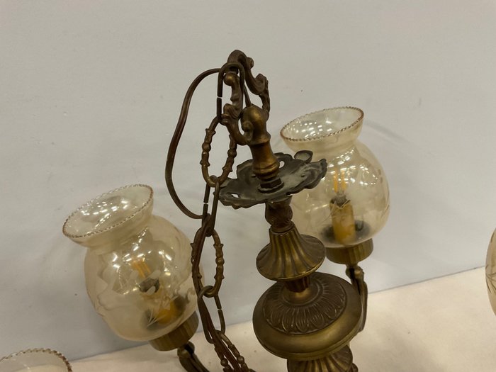 Bronskleurige met messing armatuur, 5 gebrandschilderde lampenkapjes in beige-gele kleur.