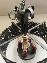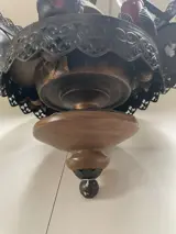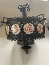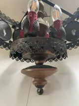 Mooie brocante hanglamp metaal bronskleur met hout en getels bloemenmotief. 4 kaarsen lampen dunne fitting. In goede staat. Afmetingen: hoogte 100 cm(incl.de ketting) doorsnede 37 cm.