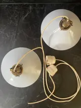 Deze twee antieke Franse plafondlampen zijn van wit glas (opalite). Beide zijn in zeer goede staat en voorzien van de originele fittingen. Tevens zijn ze voorzien van antieke plafondbevestiging van porcelein. Snoeren zijn niet origineel. Gewicht per stuk ca. 550 gram.