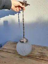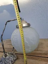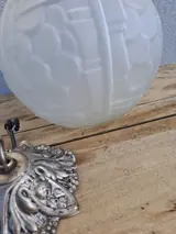 Deze prachtige art deco matglazen bol heeft een ongelooflijk design, hij dateert natuurlijk van voor de oorlog en is in zeer goede staat! De metalen montage en elektrificatie zijn nieuwer, de ophanging is in werkende staat. Enkele kleine defecten aan de metalen bevestiging.