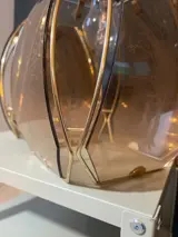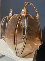 Duo hanglampen in uitstekende staat. Goudkleurig metaal en licht koperkleurig glas-in-lood (met een boommotief op elk facet)