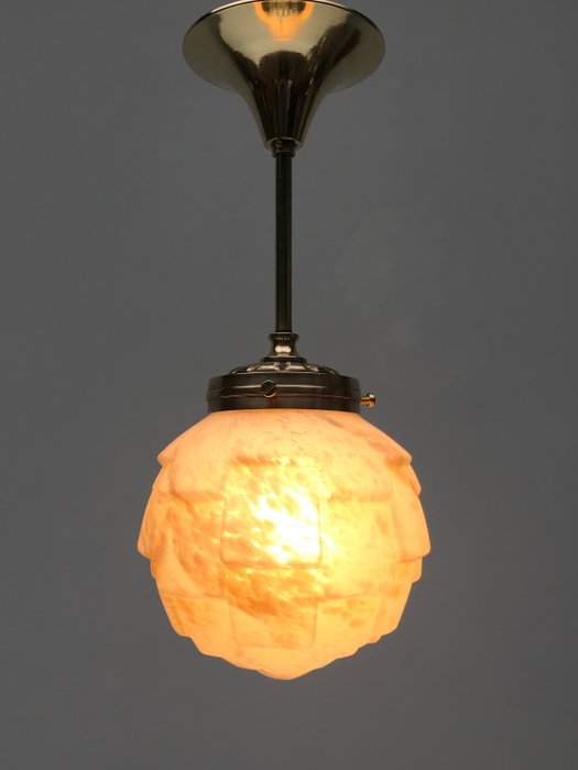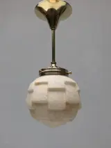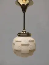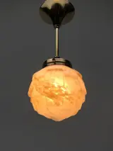 Mooie hanglamp / plafondlamp van messing met een gewolkte glazen kap.