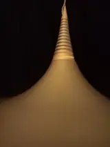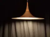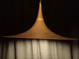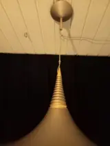 Erg mooie hanglamp, ook wel heksenhoed lamp genoemd. De reden is duidelijk, de vorm van de lamp is die van een heksenhoed. De lamp dateert waarschijnlijk van de jaren '80 van de vorige eeuw en heeft helemaal die typische flower-power-uitstraling. De lamp is 25cm hoog en het breedste gedeelte heeft een diameter van 47cm(!). Hij weegt ongeveer 1200g, De kleur is koperkleurig. De lamp is gemaakt van gespoten metaal, met kunststof en messing elementen.