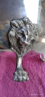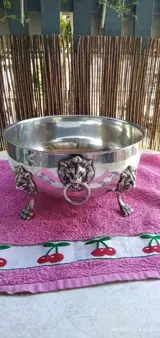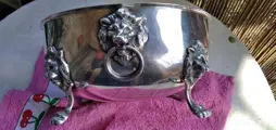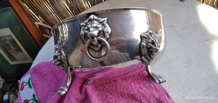 Zilverlegering houder (alpaca AM) gegraveerd, met 4 leeuwenpoten en 2 handvatten ook met een leeuwenkop.