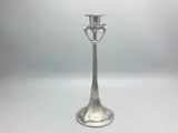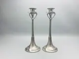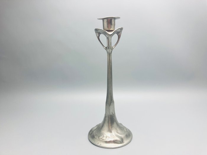 Een stel tinnen kandelaars in art nouveau stijl naar ontwerp van Hugo Leven uit 1901/1902 voor de firma Kayserzinn. Uitgevoerd aan het eind van de 20e eeuw (een zogenaamde 'nachgus'). De kandelaars zijn niet gemerkt maar staan afgebeeld in het oeuvreboek Kayserzinn (zie laatste twee foto's). Afmeting: 27 cm hoog