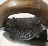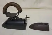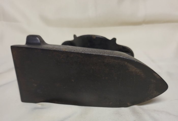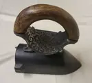 Heel mooi ijzer het handvat is van hout. Het holle lichaam bevat een gietijzeren staaf, die kan worden verwijderd via een luik aan de achterkant van het strijkijzer. Op het gezicht van de baar