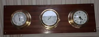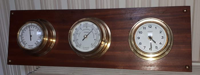 compleet nautisch weerstation op mooie plank met koperen versieringen.