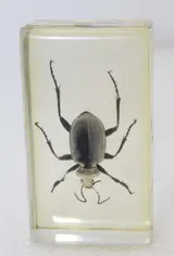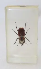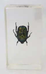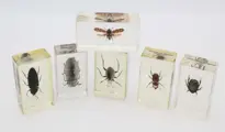 Set van zes Scarabee en andere insecten verpakt in Lucite-blokken.