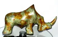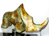 Bronzen beeld dat een neushoorn voorstelt.