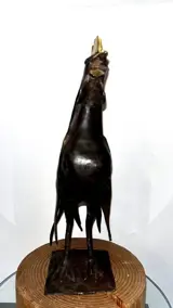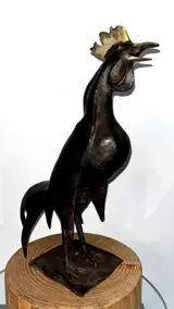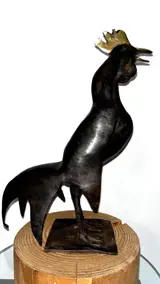 Sculptuur gesigneerd die een haan voorstelt.